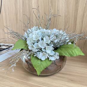 Arranjo Grande Centro de Mesa Hortênsias Azul Artificial Vaso Incolor