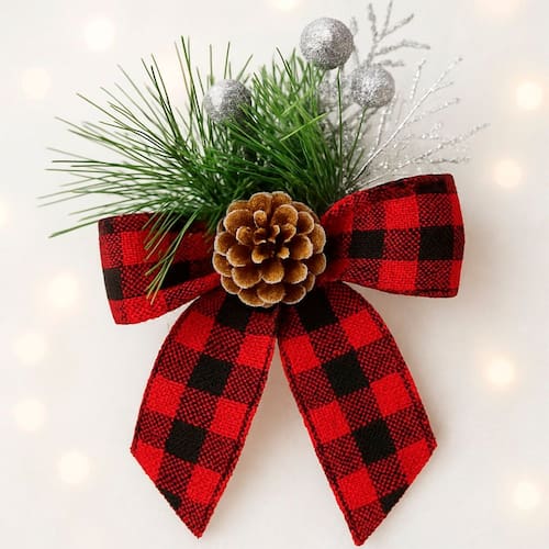Transforme sua decoração de Natal com este lindo arranjo com laço xadrez e raminhos de pinheiro, perfeito para árvores, guirlandas, festões, mesas, portas e embalagens de presente. Um toque clássico, delicado e cheio de charme natalino!