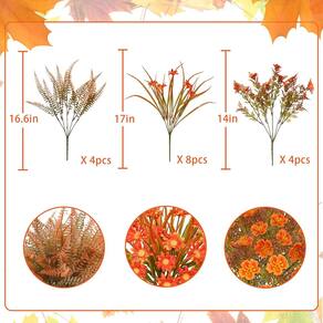 Estas plantas falsas de outono têm caules flexíveis e folhas generosas, fáceis de usar como decoração de outono ao ar livre. - Pacote: Há 16 peças de flores falsas de outono em um pacote, principalmente pequenas mães de outono - Resistente a UV: A planta artificial de outono é feita de material resistente a UV, garantindo que essas decorações de outono não desbotem após a exposição à luz solar, perfeita para suas decorações de outono ao ar livre em casa - Baixa manutenção: estas plantas falsas de outono não requerem irrigação ou poda, permitindo que você aproveite sua cor vibrante e aparência total sem esforço. Elas são perfeitas para pessoas modernas que desejam uma decoração fácil de outono - Opções de decoração versáteis: As hastes florais de outono são adequadas para decorar a sala de estar, café, caixa de janela, lareira, centros de mesa, Ação de Graças, casamento, colheita, etc - Estilo fácil: Estas flores artificiais de outono são projetadas para um arranjo simples. Onde quer que você queira decorar, ajudando você a criar incríveis exibições de outono que elevam sua decoração sem esforço