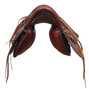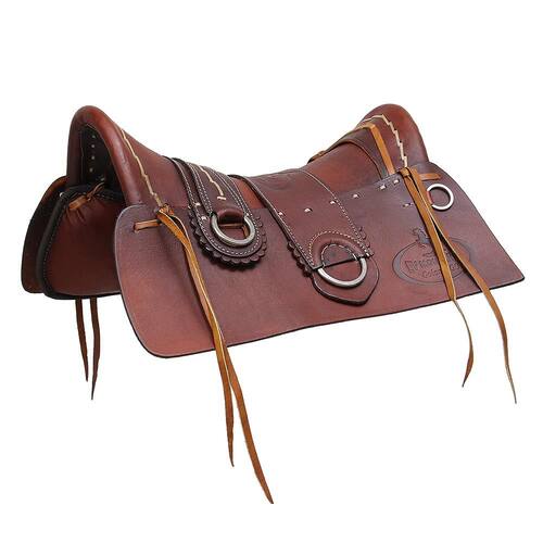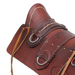 Arreio Ev Montaria modelo Pantaneiro, utilizado em Muares e Equinos, fabricado em couro nobre cor Havana com costuras reforçadas, tamanho livre do assento de 17", armação de chapa de ferro inervada e acabamento do suador com enchimento em feno, revestimento em couro e bordas em nylon costurado. Acompanha travessão fixo e argolas em aço inox.