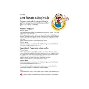 Arroz parboilizado, tomate desidratado, manjericão desidratado em flocos, alho desidratado granulado, cebola desidratada granulada, tomate em pó e açúcar. NÃO CONTÉM GLÚTEN.