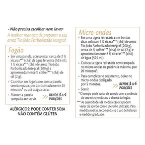 MICRO-ONDAS: Em um tigela refratária com bordas altas colocar: 1 xícara (200g) de arroz Tio João Parboilizado Integral, 1 colher (chá) de sal e 1 colher (sopa) de óleo. Acrescentar 2 xícaras (525ml) de água quente. Colocar a tigela refratária semitampada no micro-ondas na potência máxima e cozinhar por 20 minutos*. Desligar o micro-ondas e esperar 2 minutos. Servir. RENDE 3 A 4 PORÇÕES.