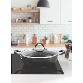 Arrozeira Mônaco Tramontina 28Cm 4,2L Antiaderente Indução Preta Fazer aquele arroz branco soltinho e delicioso ficou muito mais fácil com a Arrozeira Tramontina Mônaco Induction em Alumínio com Revestimento Interno e Externo Antiaderente Starflon Premium Preto com Tampa de Vidro 28 cm de diâmetro 4,2 L Produzida em alumínio com revestimento antiaderente Starflon Premium, ela evita que os alimentos grudem em sua superfície, é mais durável e não é prejudicial à sua saúde. O cabo é metálico com proteção de silicone e reduz a propagação de calor, aumentando a segurança e melhorando seu manuseio. Ela acompanha tampa de vidro temperado que auxilia na preparação e é a escolha perfeita para cozinhar os alimentos de maneira rápida e uniforme Contém: 1 Arrozeira 28cm 4,2L Importante: Corpo de alumínio com espessura de 3,0 mm que proporciona cozimento rápido e uniforme. Revestimento interno e externo de antiaderente Starflon Premium que não gruda, é fácil de limpar, mais durável e não é prejudicial a saúde. Tampa de vidro temperado com borda de aço inox e saída de vapor. Alças e pegadores metálicos com proteção de silicone que proporciona redução da propagação de calor, aumentando a segurança e melhorando a empunhadura. Podem ir à máquina de lavar louças facilitando seu dia a dia. A capacidade volumétrica máxima para cozimento é de 3/4 da capacidade total da peça. Posicione os cabos dos utensílios voltados ao centro do fogão. Em fogões com grade, centralize a peça e alinhe o cabo com a grade. Utensílios quentes devem estar fora do alcance das crianças. Este produto não pode sofrer modificações. Antes do primeiro uso, lave com esponja macia, sabão neutro ou detergente líquido. Depois de secar, unte a área interna com óleo ou gordura e leve ao fogo por um ou dois minutos. Deixe esfriar e lave novamente. Seu utensílio Starflon está pronto para uso com ou sem gordura, sempre em fogo baixo ou médio nunca superior a 350ºC . Para mexer os alimentos use somente utensílios de silicone, nylon ou madeira. Evite a imersão do utensílio quente em água fria. Nunca utilize produtos abrasivos na lavagem. Se deixar queimar alimentos, umedeça a área e até que possa remover os resíduos grudados com esponja e sabão. Para descarte dos produtos e embalagens siga as orientações de reciclagem vigentes. Este produto não necessita de manutenção, apenas limpeza. Peso Bruto: 2,2200 kg. Metragem: 0,011948 m³. Dimensões Embalagem Compr. X Larg. X Alt. : 400x 290x 103 mm. Dimensões Produto Compr. X Larg. X Alt. : 400x 291x 165 mm. Diâmetro: 28,0 cm. Capacidade: 4,20 l. Espessura: 3,0 mm.