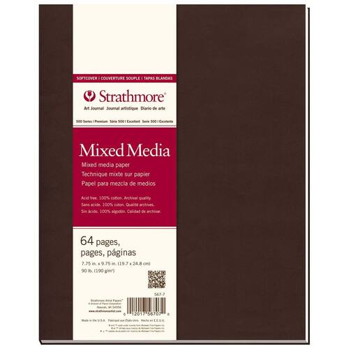 Strathmore Diário de arte de mídia mista de capa mole 567-7-1, 19,7 cm x 24,8 cm, branco, 64 páginas - Tamanho interno para uso com mídia úmida com um acabamento de pergaminho durável para técnicas de desenho. - Papel de grau de arquivo e sem lignina. - 40,8 kg - 100% algodão, sem ácido - Feito nos EUA