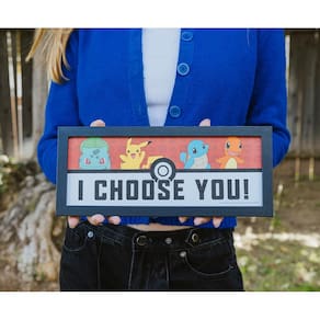- DESIGN DIVERTIDO: A arte de parede em madeira apresenta vários personagens Pokémon e diz “Eu escolho você!”.