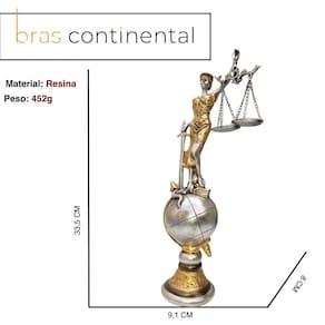 Descrição: Estátua Themis, deusa da justiça, acompanhada de uma pequena balança. Características: Fabricado em resina. Pintura altamente resistente com excelente acabamento. Por se tratar de um produto semi-artesanal, pode haver leve alteração na tonalidade. Cor dourada com sinais de oxidação (pintura). Medidas: Altura: 33,5 cm Largura: 9,1 cm Comprimento: 8 cm Peso: 452 g Observação: As imagens contidas neste anúncio são fotos reais do produto. Marca: Não Informado