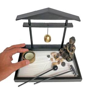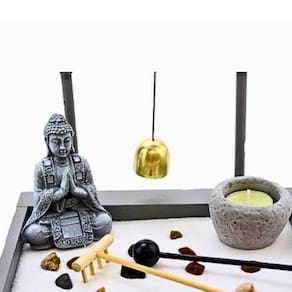 Com medidas de 22 x 15,5 x 18 cm e peso de 687g, ele se encaixa facilmente em diferentes espaços. Feito de resina, madeira e areia, o kit é durável e elegante, ideal para criar um ambiente de meditação e tranquilidade.