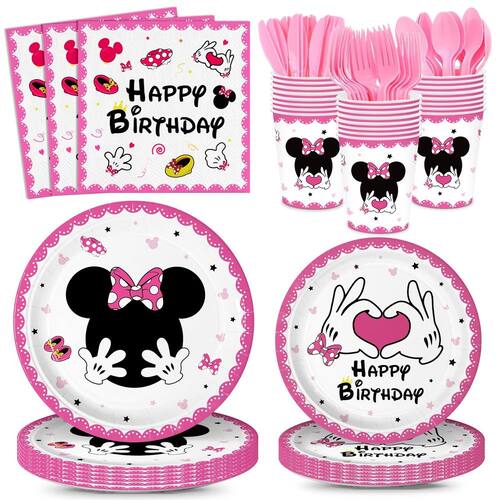- ?Pratos de aniversário de rato de desenho animado? Os pratos e guardanapos de festa de aniversário da menina apresentam um rato rosa, com características fofas de desenho animado que parecem dançar vividamente. Todo o design usa uma combinação de rosa, adicionando atmosfera à festa de aniversário, e as crianças definitivamente vão adorar.
