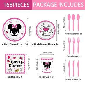 - ?Suprimentos para festa de aniversário? Você receberá 168 peças de suprimentos de festa de aniversário, incluindo 24 pratos de jantar de 23 cm, 24 pratos de sobremesa de 18 cm, 24 guardanapos de papel, 24 copos de papel e 24 garfos, colheres e facas rosa, o suficiente para você realizar uma festa de aniversário inesquecível.