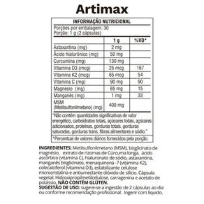 Colágeno hidrolisado: Auxilia na regeneração e fortalecimento das cartilagens articulares.Glucosamina: Componente essencial para o fortalecimento das articulações e prevenção de desgastes.Condroitina: Contribui para o alívio da dor e melhora da lubrificação das articulações.Ácido hialurônico: Melhora a elasticidade das articulações e promove a hidratação.Vitaminas e minerais: Auxiliam na absorção e eficácia dos ingredientes principais. Benefícios do Artimax (60 Caps): Fortalece as articulações: Melhora a saúde das articulações e cartilagens, auxiliando na sua regeneração.Aumenta a flexibilidade: Facilita o movimento e a mobilidade, proporcionando mais liberdade nas atividades diárias.Reduz inflamações: Combate processos inflamatórios, aliviando dores nas articulações.Prevenção de lesões: Ajuda a prevenir danos nas articulações, especialmente para pessoas com alto nível de atividade física.Melhora a lubrificação articular: Promove uma melhor lubrificação das articulações, contribuindo para a saúde geral delas.Alívio da dor: Proporciona alívio para dores articulares e musculares, principalmente em casos de desgaste.Ação antioxidante: Auxilia na proteção das células contra danos causados pelos radicais livres, preservando a saúde das articulações. Sugestão de uso:Para obter os melhores resultados com o Artimax (60 Caps), recomenda-se ingerir 1 cápsula por dia, preferencialmente junto à refeição principal.