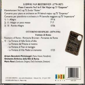 Arturo Benedetti-Michelangeli - Concerto para o Papa 1960 Arturo Benedetti juntamente com a Orquestra Sinfônica della RAI di Roma e o regênte Mario Rossi fazem um concerto inesquecível no Vaticano para o Papa Giovanni XXIII, 28 de Abril de 1960. Beethoven - Piano concerto No.5 in E flat Major op.73 ''Emperor'' Respighi - Fontane di Roma Marca: Não Informado
