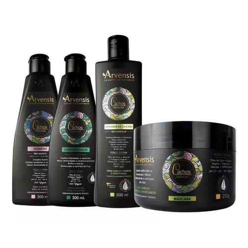 Arvensis kit sh.+ cond.+ativ.500ml + masc.250 crespos e cresNeste anúncio contém:1 unidade shampoo cachos naturais arvensis 300ml1 unidade condicionador cachos naturais arvensis 300ml1 unidade ativador de cachos crespos e crespíssimos arvensis 500ml1 unidade máscara crespos e crespíssimos arvensis 250gShampoo cachos naturais arvensis 300mlO shampoo cachos naturais foi desenvolvido com uma formulação livre de sulfato e sal, especial para a limpeza suave de todos os tipos de cabelos cacheados. Elaborado através da perfeita combinação de óleo de coco, colágeno vegetal e vitamina e, o shampoo cachos naturais proporciona inúmeros benefícios como reparação dos fios danificados, aumento da elasticidade, maciez e brilho extra. Sua ação protetora ainda confere resistência, formação de filme e controle de frizz, além de manter a umidade natural para cachos nutridos e radiantes.Principais ativos:- óleo de coco: alto poder umectante e hidratante, repõe nutrientes e age na diminuição do frizz. Ainda tem ação de selamento de cutículas evitando pontas duplas.- colágeno vegetal: fornece aminoácidos e proteínas para nutrição funcional da fibra, promove hidratação e restaura a elasticidade dos fios. Forma um filme flexível ultra-substantivo que protege e define os cachos, além de atuar no controle do frizz.- ph 5-6Condicionador cachos naturais arvensis 300mlO condicionador cachos naturais foi desenvolvido com uma formulação especial, ideal para a hidratação de todos os tipos de cabelos cacheados. Elaborado através da perfeita combinação de óleo de coco, colágeno vegetal e vitamina e, o condicionador cachos naturais proporciona inúmeros benefícios como nutrição avançada, reparação dos fios danificados, condicionamento equilibrado, aumento da elasticidade, maciez e brilho extra. Sua ação protetora ainda confere resistência e controle de frizz, além de manter a umidade natural para cachos nutridos e radiantes.Principais ativos:- óleo de coco: alto poder umectante e hidratante, repõe nutrientes e age na diminuição do frizz. Ainda tem ação de selamento de cutículas evitando pontas duplas.- colágeno vegetal: fornece aminoácidos e proteínas para nutrição funcional da fibra, promove hidratação e restaura a elasticidade dos fios. Forma um filme flexível ultra-substantivo que protege e define os cachos, além de atuar no controle do frizz.- ph: 4-4,5Indicação: todos os cachos.Creme ativador cachos crespos e crespíssimos arvensis 500mlO ativador de cachos crespos e crespíssimos foi desenvolvido para definir a ondulação, possui ação protetora, resistência, formação de filme, controle de frizz, mantendo a umidade natural e definindo cachos radiantes. Contém filtro solar. 500ml - ph 3,5 - 4,5Indicação: cabelos crespos e crespíssimos 3b / 3c / 4a / 4b / 4c .Principais ativos: óleo de coco; colágeno vegetal; abacate.Máscara cachos crespos e crespissímos arvensis 250gA máscara crespos e crespíssimos promove hidratação equilibrada com ação intensiva proporcionando inúmeros benefícios como nutrição avançada, reparação dos fios danificados, maciez e brilho extra. 250g - ph 3,5 - 4,5Indicação: cabelos crespos e crespíssimos 3b / 3c / 4a / 4b / 4c .Principais ativos: óleo de coco; colágeno vegetal; abacate.