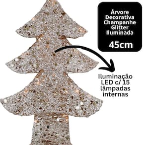 Encante sua decoração com esta sofisticada árvore aramada iluminada no tom champanhe com acabamento em glitter e estrelas decorativas. Seu design exclusivo une a elegância do fio metálico aramado com revestimento em glitter champanhe e o brilho suave das 15 luzes LED integradas, proporcionando um toque mágico e acolhedor ao ambiente.