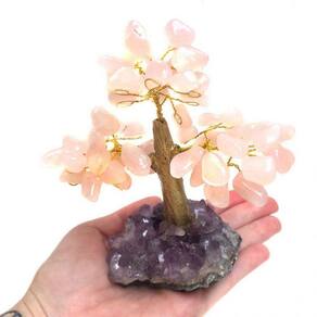 Árvores da Felicidade ou Árvore da Sorte/Fortuna - Bonsai - Árvores Decorativas - Enfeites - Mesa de Trabalho - Energia - Decoração Emitimos Nota Fiscal Eletrônica para todos os Produtos. Foto demonstrativa do lote. Por se tratar de uma peça artesanal, podem conter uma pequena variação na tonalidade das pedras e no formato da base de drusa. Os arames são moldáveis. Altura média: 12cm Largura média 10 cm Material: Pedras Naturais Peso médio 290 gramas Um pouco sobre a Ametista, conforme a Bíblia dos Cristais: Ela transmuta a energia em amor. Essa pedra nos protege, é extremamente poderosa, com uma vibração altamente espiritual. É um calmante natural e bloqueia as energias negativas do ambiente. A sua serenidade favorece a meditação e estados de consciência mais elevados. Aguça a percepção espiritual e tem um forte poder de cura e purificação. Ela é usada para desenvolver a sensatez, ela combate vícios e bloqueios de todos os tipos. A ametista é benéfica para a mente, pois acalma e estimula de acordo com a necessidade. Durante a meditação ela desvia os pensamentos de questões mundanas e inspira tranquilidade e uma compreensão mais profundas. Conecta causas a efeitos e favorece a assimilação de novas ideias. Ela facilita o processo de tomada de decisões e é útil quando a mente hiperativa causa insônia. Aumenta a motivação, dissipa a raiva, o ódio, medo e ansiedade, alivia a tristeza e a dor. É uma das pedras mais espirituais que se conhece, abre a intuição. Conecta os corpos físico, mental e emocional, ligando-os ao espiritual. Um pouco sobre o Quartzo Rosa, conforme o livro: o caminho das pedras: Quartzo Rosa é o cristal do amor! Pedra fundamental do Chakra Cardíaco. Representa o amor incondicional, através de sua suave emanação, permite a lembrança da essência amorosa, do propósito, despertando no centro do ser esse amor sem cobranças, sem culpas ou mágoas, sem posse e sem medo, o amor a todos os aspectos do ser e do universo, um amor com perdão, consciência e compaixão. Munido dessa energia, o indivíduo está pronto para expandi-la e para criar uma nova realidade em vida e no universo. O quartzo rosa ensina o poder do perdão e reprograma o coração a amar, auxiliando na construção e manutenção da auto-estima e da auto-aceitação.