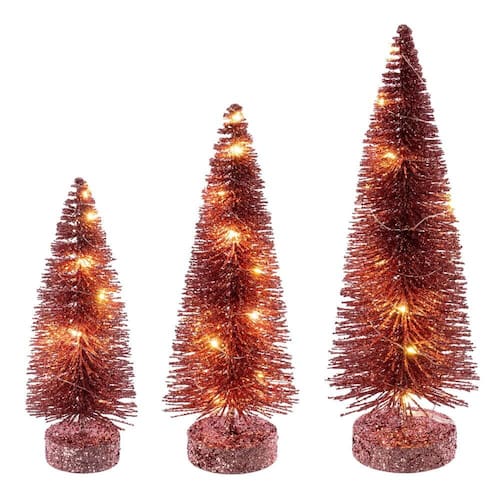 Conjunto de pincéis para garrafas Vickerman 81012 Rose Gold Lit. Ilumine sua mesa de Natal com nosso trio de Bottle Brush Trees, com 8, 10 e 12 para uma exibição encantadora. Adornada com delicadas luzes de fadas transparentes, cada árvore opera de forma independente com sua própria bateria, exigindo um total de 9 pilhas AA. A bateria oferece três configurações de desativação, ativação e um conveniente cronômetro de 6 horas para um ambiente de férias sem esforço. Abrace a magia da temporada com essas decorações extravagantes e versáteis. Baterias não incluídas. Especificações. Cor rosa dourada. Tamanho 81012. Digite Árvore de mesa. Estilo leve operado por bateria. Material primário PVC, fio de ferro, glitter, base de MDF