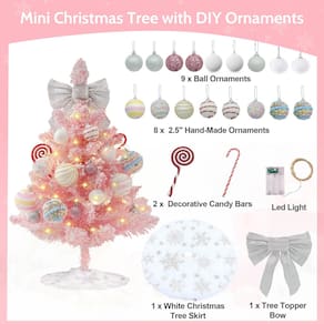 - AS MINI DECORAÇÕES DE ÁRVORE DE NATAL ROSA INCLUEM: Cada conjunto de pequena árvore de Natal rosa de 24 polegadas inclui uma variedade de acessórios: 1 peça de mini suporte de árvore de Natal rosa, 1 peça de saia de árvore de Natal branca, 1 peça de decoração de laço prateado, 1 peça de pirulito decorado, 1 peça de canudo decorado, 17 peças de enfeites de bolas de Natal coloridos (tamanhos e materiais de cores diferentes).