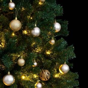 - Árvore de Natal: - - Cor: verde- - Material: PVC (cloreto de polivinilo), metal- - Altura total: 150 cm- - Diâmetro do fundo: 97 cm- - Tamanho do suporte: 50 x 15 cm (L x A) - - Construção articulada- - Com 793 pontas de PVC- - Adequado para áreas protegidas, como telhados, varandas, coberturas, etc.- - Conjunto de bolas de Natal: - - Cor: brilhante ouro rosa, ouro rosa fosco e ouro rosa brilhante- - Material: plástico, PVC- - Comprimento total da linha de LED: 15 m- - Números de LEDs: 150 LEDs- - Voltagem: DC 5 V- - Potência: 5 W- - Possui 8 efeitos de luz- - Interface USB- - Montagem necessária: Sim- - A entrega contém: - - 1 x árvore de Natal com dobradiças artificiais- - 1 x suporte- - 1 x luz LED de corda- - 1 x Peak- - bola de 20 x 3 cm- - bola de 21 x 4 cm- - bola de 20 x 6 cm-