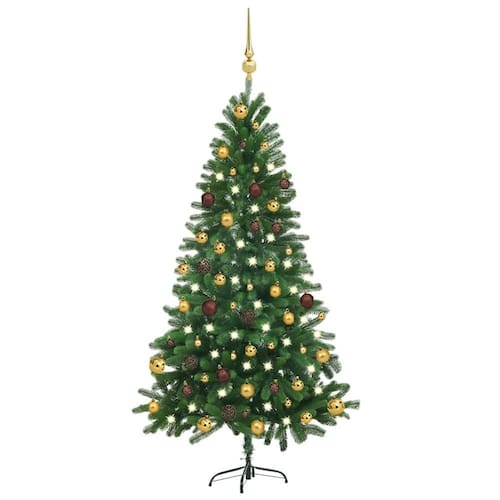 Esta árvore de Natal artificial pré-iluminada de 59,1 polegadas adiciona um toque mágico a qualquer sala de estar, capturando o espírito festivo com sua aparência verde exuberante e luzes quentes. A elegante árvore verde está decorada com lindas bolas decorativas em ouro e bronze brilhantes, criando uma peça central deslumbrante para