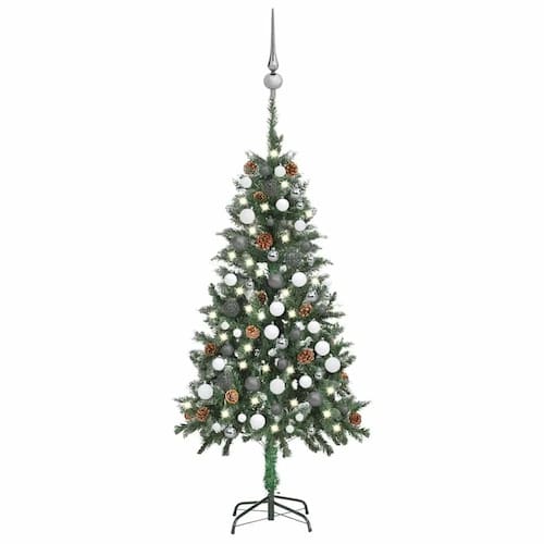 - Pinhas e bolas decorativas: inclui pinhas naturais e uma variedade de bolas em branco brilhante e cinza brilhante, juntamente com um pico brilhante, adicionando um toque festivo à árvore