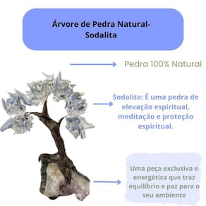 Árvore de Pedra Natural Sodalita Presente e Decoração Árvore de Pedra Natural Sodalita Esta Árvore de Pedra Natural Sodalita é mais do que uma peça decorativa: é uma fonte de energia positiva e serenidade. A sodalita é famosa por suas propriedades de promover a paz interior, aumentar a autoconfiança e fortalecer a comunicação. Pedra natural sodalita: A sodalita é muitas vezes considerada uma pedra que ajuda a despertar a intuição e a aumentar a sabedoria interior. Ela é excelente para aqueles que buscam clareza mental e visão espiritual mais profunda. Conhecida como a pedra da comunicação, a sodalita ajuda a promover a expressão honesta e clara, tanto nos relacionamentos pessoais quanto nas interações profissionais. Excelente para equilibrar as emoções, promovendo um estado de calma interior e ajudando a aliviar a ansiedade e o . Ela ajuda a acalmar os pensamentos acelerados e a trazer clareza mental, reduzindo a confusão emocional. Enviamos o seu pedido em até 24 horas após a confirmação do pagamento Caso tenha alguma dúvida nos mande mensagem que responderemos rapidinho para te ajudar da melhor forma possível Marca: Não Informado