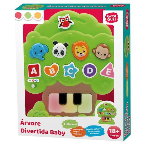 Árvore Divertida Baby - Som e Luz - Guta Guti - DM Toys: a linha Guta Guti da DM Toys apresenta uma série de produtos e brinquedos pensados especialmente para o aprendizado e desenvolvimento do seu bebê. Uma linha com produtos coloridos, didáticos, educativos e cheios de funcionalidades para o bebê aprender brincando. A Árvore Divertida Baby é educativa, auxilia no aprendizado de letras, formas, cores e animais. Aprenda em 03 idiomas diferentes: Português, inglês e espanhol. Contém som, luz e música. INFORMAÇÕES: • Produto: Árvore Divertida Baby com Som e Luz • Linha: Guta Guti • Marca: DM Toys • Tipo: brinquedo para bebê • Tamanho (C x A x L): 22.5 x 19.5 x 4.5 cm • Conteúdo: 01 brinquedo árvore divertida • Recomendação: para bebês a partir dos 18 meses de idade ESPECIFICAÇÕES: • Referência: DMB5812 • Embalagem (C x A x L): 25 X 21 X 07 cm • Embalagem (Peso): 0.420 kg • Material / Composição: PP, HIPS, POM • Funcionamento: Utiliza 2 pilhas "AAA" (não incluídas) • Registro: CE-BRI/OCP0019 BR-041/21 • Certificado: Órgãos Autorizados - OCP´S (Organismos de Certificação de Produtos) BENEFÍCIOS DE BRINCAR: - Eleva a autoestima - Exercita a memória - Estimula o raciocínio - Exercita o imaginário - Desenvolve a criatividade - Desenvolve percepção visual - Desperta a atenção e curiosidade - Desenvolvimento neuropsicológico - Estimula habilidades motoras básicas - Incentiva a comunicação e linguagem - Desenvolve aspectos emocionais e afetivo - Estimula o reconhecimento de formas e cores AVISO: - As imagens são meramente ilustrativas - Os tamanhos e medidas são aproximados - As cores e estampas dos produtos podem ter variações - As informações são de responsabilidade do fabricante ou fornecedor