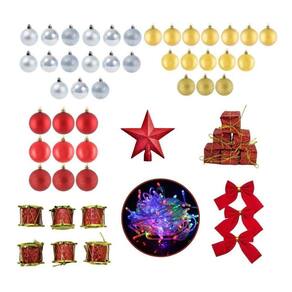15 bolas dourada 4cm 15 bolas vermelha 4cm 15 bolas prata 4cm 12 laços vermelhos 6 caixinhas de presente 1 ponteira pode ir na cor dourada ou vermelha 1 pisca pisca led 100 lâmpada 110v