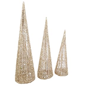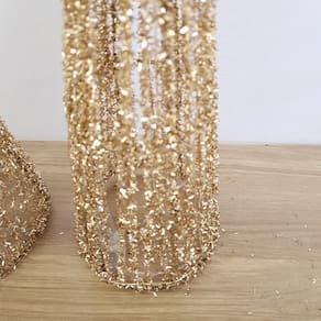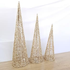 TRIO DE ÁRVORES DE NATAL, FORMATO CÔNICAS, ESTRUTURA ARAMADA, REVESTIDA COM FIOS DE PVC NA COR CHAMPANHE COM ILUMINAÇÃO DE LEDS (2 pilhas AA).
