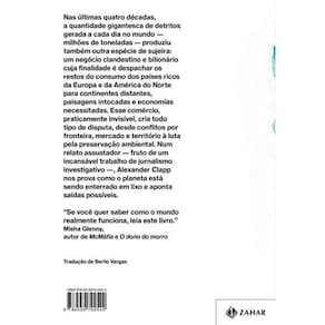 Fruto de um incansável trabalho de jornalismo investigativo, este é o primeiro grande livro a expor a realidade catastrófica do comércio global de lixo — um negócio clandestino cuja finalidade é despachar os restos do consumo dos países ricos da Europa e da América do Norte para continentes distantes, paisagens intocadas e economias necessitadas. Para escrever esse livro, o jornalista Alexander Clapp passou dois anos seguindo o rastro do lixo pelo mundo. Conversou com gângsteres da reciclagem em , desmanteladores de cruzeiros na Turquia, catadores de plástico na Tanzânia, ativistas do meio-ambiente na Guatemala e jovens que desmontam e queimam celulares e televisores ocidentais por centavos a hora em Gana. Com isso, constatou que grande parte do nosso lixo tem uma vida posterior secreta. Enquanto uma parcela é enterrada ou jogada na beira de estradas, outra bem maior não tem mais onde ser posta e precisa sumir da vista das populações ricas. O lixo vira produto e alimenta um mercado bilionário e oculto, sendo vendido, revendido ou contrabandeado de um país para outro, com consequências devastadoras e todo tipo de disputa, desde conflitos por fronteira, mercado e território à luta pela preservação ambiental. Apresentando personagens e situações impressionantes, o autor mostra como o silêncio sobre o assunto é político e serve para que os maiores produtores e exportadores de detritos mantenham encoberta a sujeira, literal e moral, de uma globalização tenebrosa que vem de longe. “Se você quer saber como o mundo realmente funciona, leia este livro.” - Misha Glenny, autor de McMáfia e O dono do morro