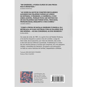 Por meio da memória, Natalia Ginzburg se aproxima das cores e dos sons da sua infância e juventude. Escrito enquanto vivia em Londres e publicado em 1961, a lembrança aqui é o motor de um romance repleto de solidões, encontros e despedidas. “Em Ginzburg, a poesia surge de uma prosa nua e devastada.” — Eugenio Montale “ As vozes da noite se constrói recolhendo algumas das palavras caídas ao longo da estrada, o fraseado, a cadência, o voo ainda audível, porque ficou um vestígio no ar das palavras que foram ditas, trocadas, pronunciadas, enquanto a vida corria.” — Cesare Garboli As vozes da noite é narrado por Elsa, a tímida jovem que, para contar a sua história, apresenta antes, um a um, os membros da família, que é a verdadeira protagonista deste romance. Percorrendo os anos do fascismo e da guerra, avançando e voltando no tempo, até chegar ao pós-guerra, ela narra os personagens isoladamente para em seguida colocá-los em cena juntos, e assim mostrar como se comportam diante dos outros. As histórias individuais se entrelaçam ao pano de fundo do período, uma espécie de atmosfera compartilhada, que interfere no modo como cada um deles pode “descobrir a realidade”. Publicado em 1961, o livro abre a década em que chegarão aos leitores algumas das principais obras de Ginzburg como Léxico familiar e As pequenas virtudes . Construído com simplicidade e uma nota de ironia, As vozes da noite é um romance em que o encontro com aquilo que falta aos sonhos é vivido sempre com algo da ordem de um estupor melancólico. O assombro de descobrir a realidade, frente à fantasia, é parte do modo como Ginzburg conta uma história: uma curiosa mescla da graça e do peso da existência.