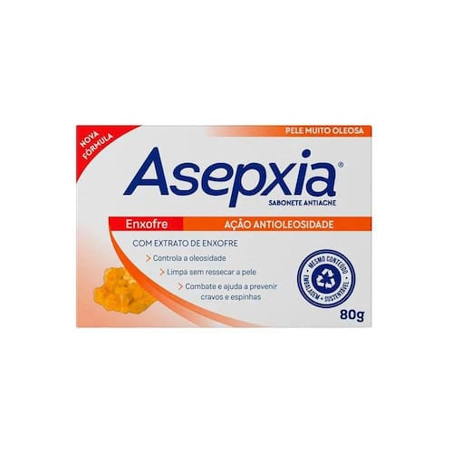 O Sabonete em Barra Asepxia Enxofre elimina impurezas e o excesso de oleosidade. Limpa profundamente os poros e reduz o excesso de oleosidade da sua pele, combatendo cravos e espinhas com a força do enxofre, um ingrediente de origem natural com ação antimicrobiana.