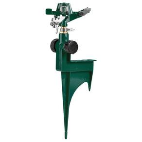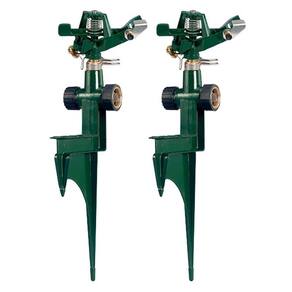 Aspersor de impacto Orbit 56351N 56351 con punta metálica de zinc, paquete de 2, color verde. - COBERTURA DE ÁREA GRANDE: Riega hasta 26 m de diámetro, cubriendo aproximadamente 527 metros cuadrados cuando se ajusta en círculo completo. - CONSTRUCCIÓN DURADERA: Materiales de zinc de alta calidad que aseguran durabilidad temporada tras temporada. - COBERTURA AJUSTABLE: Fácil ajuste para regar desde una sección parcial hasta 360° completos. - CONFIGURACIÓN PERSONALIZABLE: Use el escudo deflector y el tornillo difusor para modificar el chorro y cambiar el radio de alcance del spray. - BRAZO ANTIDERRAME: Mejora la capacidad del aspersor para rociar agua de forma uniforme y en la dirección deseada. - SALIDA DE FLUJO CONTINUO: Puede usarse como aspersor único o conectar varios en serie para ampliar la cobertura. - DISEÑO ESTABLE: Simplemente pise la punta de zinc para insertarla en suelo o césped y mantener el aspersor firme. - RESISTENTE A OBSTRUCCIONES: Diseño de flujo continuo que resiste tapones, ideal para agua secundaria.
