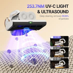 - ?Tecnologia UV-C avançada?Nosso aspirador de pó versátil possui uma luz UV-C de 253,7 nm e ondas ultrassônicas de 40.000 Hz, alcançando profundamente as camadas do colchão para remover 99,9% das substâncias invisíveis. Equipada com rodas com sensor de gravidade na base, a luz UV-C acende automaticamente quando a máquina entra em contato com a superfície e desliga automaticamente quando levantada ou inclinada para evitar vazamentos UV e garantir o uso seguro.