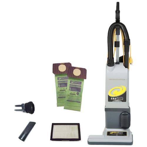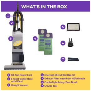 O aspirador vertical ensacado ProTeam ProForce 1500XP é um equipamento de limpeza comercial de alta qualidade, projetado para oferecer uma limpeza excepcional em hotéis, motéis, resorts e salas de reuniões. Com um cabeçote de limpeza exclusivo em forma de L de 15 polegadas de largura, o aspirador é capaz de mover se facilmente sob e ao redor dos móveis. O poderoso DualMotor de 924 watts e 10 A produz um fluxo de ar de 96 CFM e elevação estática de 213 cm, garantindo eficiência ideal e eficácia máxima. A filtragem ProLevel com filtro de mídia HEPA captura e contém poeira, pêlos de animais e outros alérgenos para produzir um ar mais limpo e saudável. O aspirador vertical comercial ProForce 1500XP inclui uma mangueira super extensível, uma varinha de liberação rápida, uma ferramenta para fendas para limpeza profunda nos cantos e uma escova combinada para poeira de estofamento que remove suavemente a poeira e alérgenos de móveis, persianas e abajures. Ele vem com um cabo de alimentação extralongo de 15,2 Metros de calibre 18 para limpar grandes áreas sem ter que desconectar. Todos os aspiradores ProTeam se qualificam para Liderança LEED em Energia e Design Ambiental do US Green Building Council de acordo com os requisitos atuais. Por mais de 25 anos, a ProTeam projeta aspiradores pensando na durabilidade e na qualidade. Esses aspiradores verticais comerciais são de baixa manutenção, duradouros e apresentam acabamento meticuloso e os melhores materiais disponíveis.