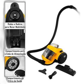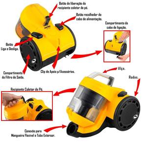Compacto e potente, com coletor removível e lavável que dispensa o uso de saco recolhedor. Possui sistema de filtragem em 3 etapas, garantindo maior eficiência. Recolhimento automático do cordão elétrico, rodas para maior mobilidade e tubo prolongador telescópico.Tipo de coletor