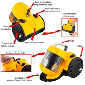 Compacto e potente, com coletor removível e lavável que dispensa o uso de saco recolhedor. Possui sistema de filtragem em 3 etapas, garantindo maior eficiência. Recolhimento automático do cordão elétrico, rodas para maior mobilidade e tubo prolongador telescópico.Tipo de coletor
