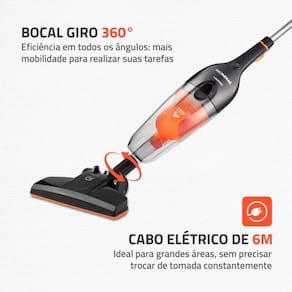2 EM 1: Possui haste removível e pode ser utilizado como aspirador vertical ou portátil. Na versão portátil, ele é perfeito para limpeza de estofados, carros e teclados.