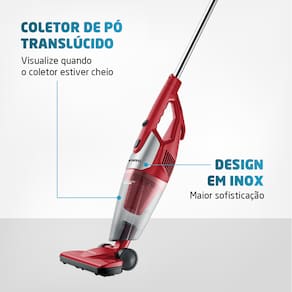 Alto poder de sucção com o novo Aspirador de Pó Vertical Turbo Premium Mondial AP-30. A função 2 em 1 lhe permite remover a haste e usar no modo portátil ou vertical. Seus 1200W de potência oferecem um poderoso poder de sucção, limpando mais rápido e com eficiência. O filtro Hepa é removível e lavável, removendo até 99,5% dos ácaros e bactérias do ambiente, e coletor de pó translúcido com capacidade para 600ML, facilita a visualização da quantidade de sujeira armazenada. Aproveite o cabo elétrico de 5 metros, e alcance diversos locais, deixando sua casa sempre limpa. O Aspirador de Pó Vertical Turbo Premium Vermelho com detalhe em INOX acompanha: 1 bocal multiuso, 1 bocal para cantos e frestas e 1 bocal para estofados. 1 ano de garantia.