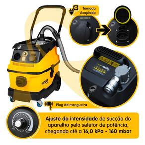 Motor de 1200W de potência, Dupla conexão (sucção e sopro), Filtro HEPA de alta eficiência, Sistema START/STOP para automação com ferramentas pneumáticas, Versátil para sólidos e líquidos, Design ergonômico com rodas e tubo prolongador, Capacidade do reservatório de 30L, Sistema de filtragem em 3 etapas, Tubo telescópico ajustável.Tipo de coletor