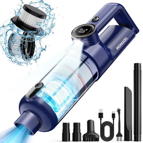 MONOZEL Aspirador portátil sem fio – Aspirador de pó para carro com motor sem escovas, sucção forte de 15000Pa, luz LED, cabo tipo C, 2 fliters, aspirador de mão portátil para casa, animal de estimação e carro