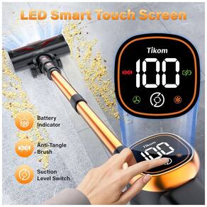 O Aspirador de Pó sem Fio Tikom V500 oferece uma potente sucção de 40kPa com um motor de 450W, ideal para lidar facilmente com pelos de animais, migalhas e sujeira em geral. Possui tela de toque LED que exibe status de funcionamento, níveis de sucção e bateria, proporcionando controle total. Com versatilidade 6 em 1, pode ser utilizado como aspirador de pó comum, manual ou para escadas, permitindo alcançar todos os cantos. O design de carregamento na parede e a bateria recarregável de 62000 mAh garantem praticidade. Além disso, possui sistema avançado de filtragem HEPA, que retém até 99,99% das partículas de poeira, melhorando a qualidade do ar da sua casa. Com um design prático de esvaziamento em um toque, luzes LED para auxiliar na limpeza de áreas escuras e cabeça de limpeza motorizada, o Tikom V500 é perfeito para uma limpeza eficiente e sem complicações.