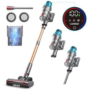 Os aspiradores da ampla variedade Ultra estão equipados com um motor super potente de 550W que proporciona ao aspirador até 45Kpa de potência de sucção, o que facilita a recolha de todo o tipo de lixo como doces, biscoitos, ração para cães, etc. e ajuda você a limpar sua casa com eficiência e rapidez A bateria removível de 2200mAh com 8 baterias integradas oferece uma autonomia de 60min no modo ECO e o potente aspirador sem fio leva apenas 45 horas para uma carga completa, perfeito para uma limpeza completa da casa. O suporte de parede recarregável integra armazenamento e carregamento, o que é muito conveniente e eficiente. A tela de toque digital permite monitorar e ajustar o status de funcionamento do aspirador de pó a qualquer momento. O aspirador sem fio oferece 3 modos EcoAutoMax para atender a todas as necessidades. É especialmente adequado para famílias com animais de estimação porque remove profundamente detritos e sujeira incrustados, como areia de gato, migalhas de comida de cachorro, pêlos de animais de estimação, etc. Para carpetes e tapetes, o modo Max e a potente escova para piso facilitam a aspiração. O Laresar Ultra 7 está equipado com uma nova escova motorizada para piso com tambor em forma de V para minimizar o emaranhamento do cabelo. A escova dois em um integrada não só reduz o incômodo de armazenamento, mas também melhora a aplicabilidade e é adequada para vários móveis e superfícies elétricas, como bancadas, laptops, sofás, etc.