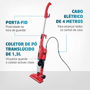 DADOS TÉCNICOS: - Voltagem: 127V - Potência: 1100W - Cor: Vermelho / Preto - Material do corpo: PP - Tipo de coletor de pó: Translúcido - Capacidade do coletor de pó: 1,3L - Tipo de filtro: Cyclone - Ação do produto: Aspirar e Limpar - Enrolador automático do fio: Não - Indicador de coletor cheio: Não - Comprimento do cabo: 4m - Medidas (AxLxP): 108x22,5x13 cm - Peso: 1,62 Kg - Garantia: 12 meses