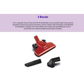 Ficha técnica: Código de barras: 7899882306484Marca: Mondial Modelo: AP-36 Turbo CycleVoltagem: 127V (não é bivolt)Potência: 1100WConsumo (KW/h): 1,1 Kw/hTipo de coletor: Coletor de pó translúcido Cor: VermelhoAspira: SólidosComprimento do Fio: 5 MMaterial/Composição: PPQuantidade de bocais: 3Conteúdo da Embalagem: 01 Aspirador de Pó, 01 Bocal Multiuso, 01 Bocal para cantos e frestas, 01 Bocal para Estofados, Manual de Instruções.Dimensões do produto (AxLxP): 108,50 x 22,50 x 13 cmPeso liq. aproximado do produto (Kg): 1,6kgGarantia do fabricante: 12 MesesFabricante: MK ELETRODOMESTICOS MONDIAL S.A. Imagens meramente ilustrativas.Todas as informações divulgadas são de responsabilidade do Fabricante/Fornecedor.Confira a voltagem selecionada antes de finalizar a compra.
