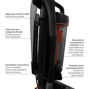 Versátil, acompanha 3 acessórios, para pisos e carpetes, escova para estofados, cantos e frestas. Tudo isso, com cabo com longo alcance, ou seja, até 4 metros de cabo elétrico sem precisar trocar de tomada evitando indesejadas interrupções.