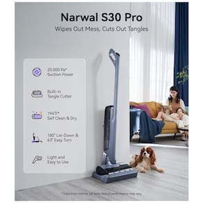 O Aspirador e Limpador Úmido Seco NARWAL S30 Pro combina sucção de 20.000 Pa com função mop para limpeza simultânea de sujeira úmida e seca em pisos duros. Equipado com tesouras integradas e pente duplo que cortam e removem fios antes de emaranhar, certificado SGS e TÜV com taxa de emaranhamento 0%. O sistema de auto-limpeza utiliza água aquecida a 90°C com dispensação automática de detergente, rotação multidirecional do rolo e secagem por barra aquecida para manter componentes secos e eficientes.
