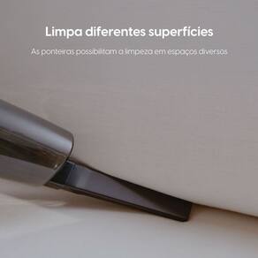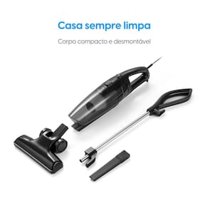 Possui filtro HEPA que retém alergênicos, coletor de pó removível, lavável e transparente com capacidade de 1L, cabo de alimentação de 4 metros e duas ponteiras para diferentes superfícies. Corpo compacto e desmontável, facilitando o armazenamento.