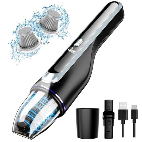 - Ultraleve e sem fio: o aspirador portátil sem fio pesa apenas 500 g, o mesmo que uma garrafa de água. A alça ergonômica e antiderrapante garante uma limpeza rápida e sem esforço com uma mão e faz você perceber que limpar o carro não é uma coisa frustrante. Além disso, o mini aspirador de pó é livre de cabos, possui grande mobilidade e conveniência e está pronto para limpeza em movimento para o seu carro e sua casa!