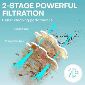 - Sistema excepcional de filtragem de camada dupla: este aspirador de piscina acima do solo apresenta um raro sistema de filtragem de camada dupla, combinando um filtro de 180 µm com uma camada de espuma texturizada para aumentar a eficiência da filtração em 50%, diferenciando-o do robô aspirador de piscina convencional. Este limpador de piscina captura com eficácia vários detritos, incluindo folhas finas, areia e muito mais, garantindo uma limpeza superior da piscina. Nota: Para piscinas muito sujas, limpe o filtro a cada 30 minutos para evitar entupimentos e possíveis danos.