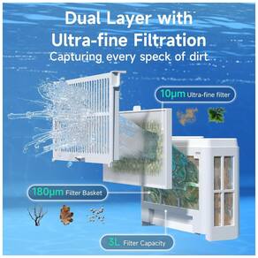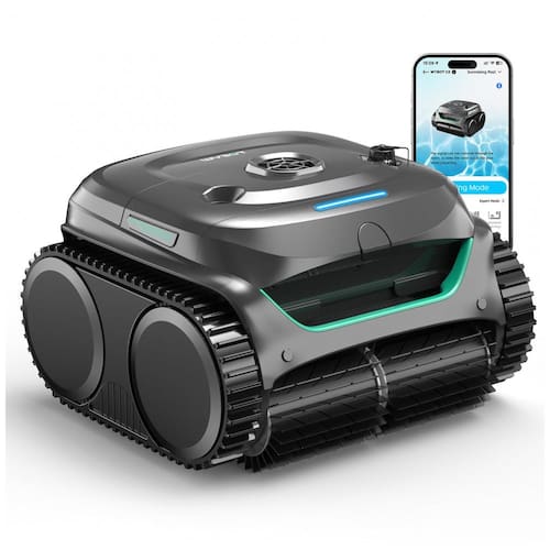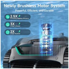 Robô aspirador para piscinas enterradas e elevadas, Potência de sucção de até 3.593 GPH, Ideal para piscinas de até 200 m², Filtro principal de 180 micra e filtro ultrafino de 10 micra, Bateria recarregável, Design sem fio, Sensores de alta precisão para navegação inteligente, Cobertura de piso, paredes, escadas e linha d'água, Sistema de estacionamento automático.Tipo de coletor