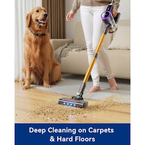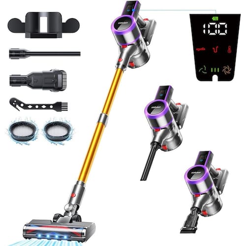 - ?Tela LED multifuncional e copo de poeira de 1,5 litro? O aspirador tem uma grande tela de LED inteligente, você pode obter o status atual do seu aspirador de pó sem esforço. Mostra o modo de sucção em tempo real, o valor restante da bateria, lembrete de bloqueio da escova de chão. Com uma grande capacidade de 1,5 L, a caixa pode ser facilmente esvaziada com o apertar de um botão.
